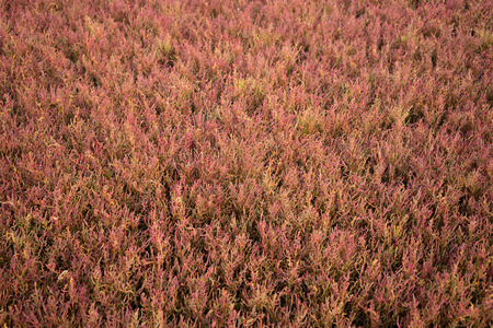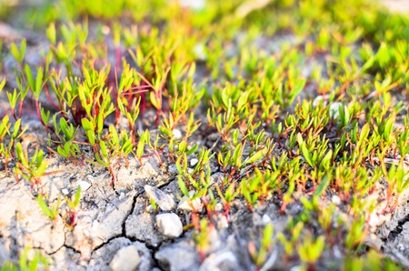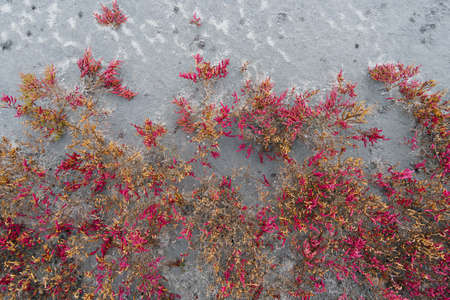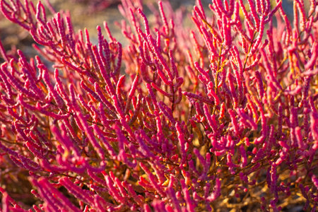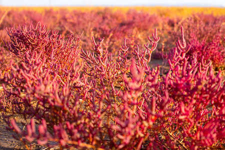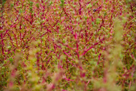 field on the shore of a salt lake with a flowering plant of bright red salicornia, soft focus.