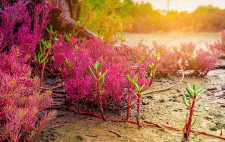 Salicornia plants at the seashore. Salicornia edible plants growing in salt marshes, beaches, and mangroves, named also glasswort, marsh samphire, samphire greens or sea asparagus.
