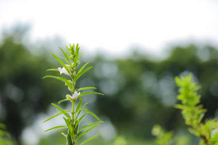 Dracocephalum grown in a rustic farm garden. White flowers in farming and harvesting. Alpine grassland.