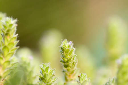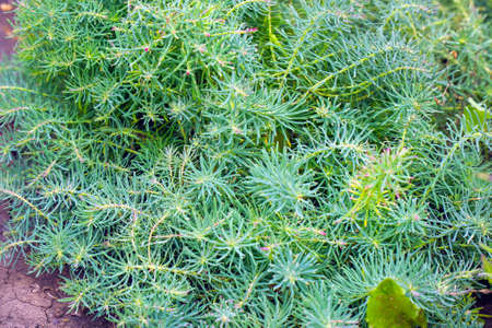 Beautiful green sprouts of Euphorbia cypress close-up. Euphorbia cyparissias. Selective Focus