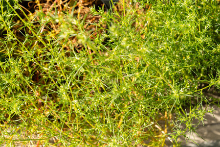 An emerald-colored plant with small leaves of medicinal asparagus. The concept of growing vegetables in the backyard garden. High quality photo