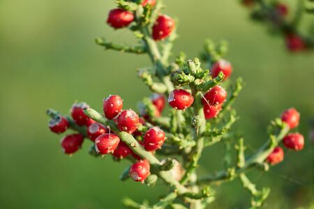 Texas Christmas Cactus. West Texas Pencil Cholla Cactus, Cylindropuntia leptocaulis with bright red rip fruits