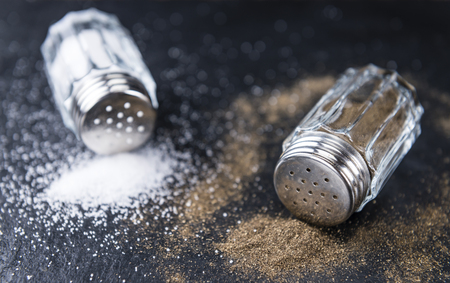 close-up on salt and pepper glass shakers with pepper spill in soft low light