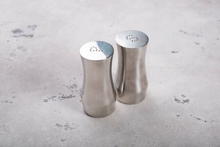 Salt and pepper shakers on gray background. Shallow depth of field.