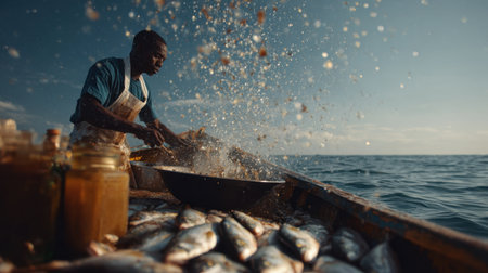 Fisherman works on a boat preparing fish in a sunny environment. The scene shows water splashing and jars nearby.