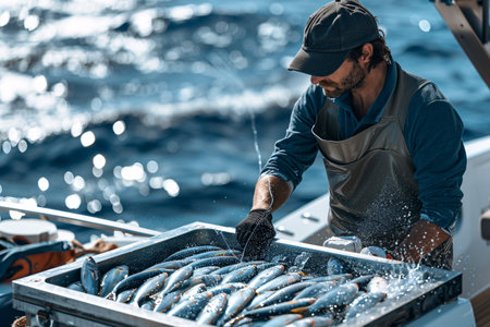 Fishermen preparing fresh fish on a boat deck, showing hard work and seafood industry