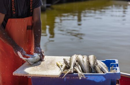 Fisherman cleaning a fresh fish caught in the sea on his small fishing boat. Cleaning fresh fish on the scales. Closeup view. Street photo. fishing business.