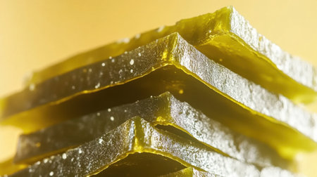 A vibrant close-up of neatly stacked seaweed snacks against a bright yellow background, highlighting their crispy texture and healthy appeal.