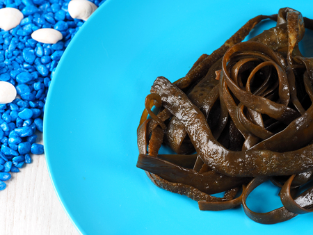 Seaweed salad on a white marble plate, close-up