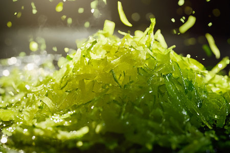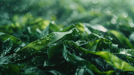 Close-up of vibrant green seaweed leaves, glistening with fresh raindrops, embodying the essence of aquatic flora.