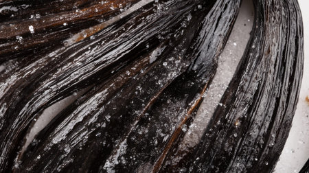 Discover the beauty of glossy vanilla beans adorned with a sprinkle of sugar, capturing the essence of gourmet cooking and the vibrant world of culinary art.