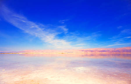 Lowest salty lake in world below sea level Dead sea, full of minerals near luxury vacation resort Ein Bokek, perfect place for medical treatments, climatotherapy, thalassotherapy and heliotherapy.