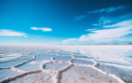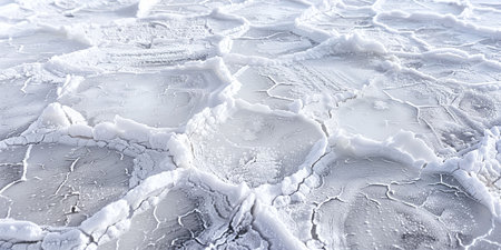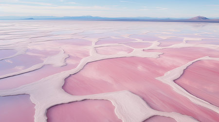 In a stunning overhead shot the salt flats reveal geometric patterns and textures emphasizing bright colors and clean aesthetics. The intricate details create a captivating visual experience.