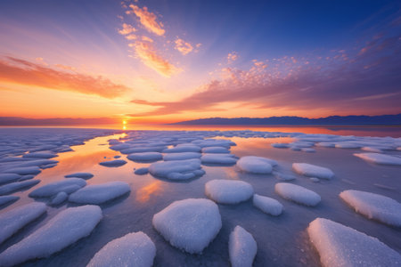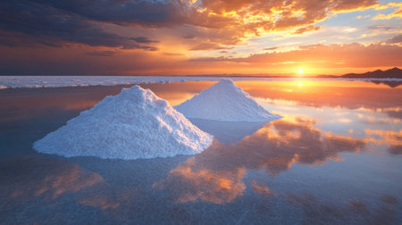 A stunning view of salt piles against a vibrant sunrise, reflecting beautifully on the calm water of salt flats. The serene scene captures natural beauty.