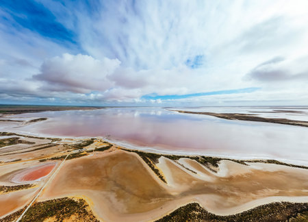 The white shore is covered with salt on a pink lake. Pink Lake has a high content of salt and bacteria that form the pink color of the water.