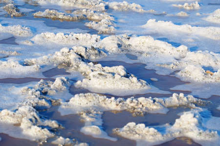 Landscape of a deserted salt lake. The texture of salt formations in the foreground. salt lake surface, dry salt lake, white salt lake
