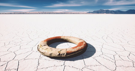 A vibrant lifebuoy lies abandoned on vast salt flats, surrounded by jagged cracks. The horizon showcases distant mountains under a clear sky, creating a surreal and tranquil atmosphere.