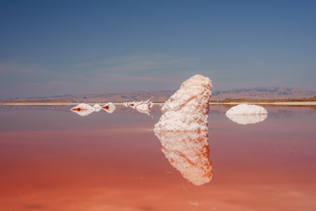 AI Generated. Salt piled high beside calm water mirrors a stunning rugged landscape under a clear sky