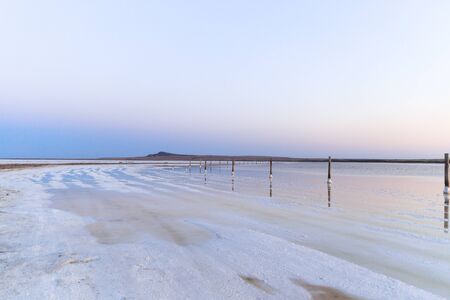 Beautiful sunset or sunrise over a salty lake, Wooden hemp in the build-up of salt after the drying of the lake.