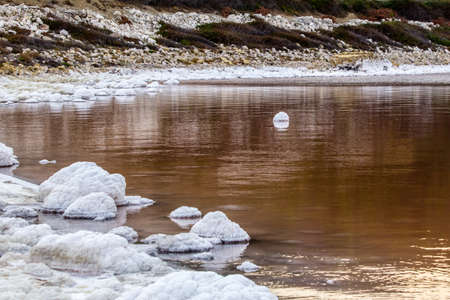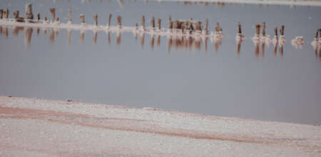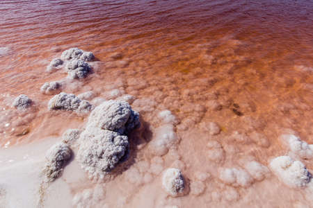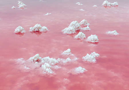 Salt crystals in pink water salt lake in Ukraine, Europe. Landscape photography