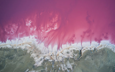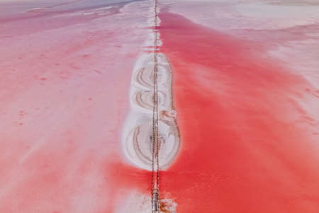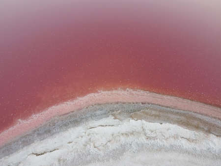 Pink lake from a height, white shores covered with salt and pink water, beautiful top view.