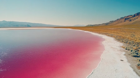 Top view of beautiful landscape with pink lake. Shot. Extraterrestrial miracle of nature-lake with pink water. Beautiful landscape with pink lake, white sand and mountains on horizon.