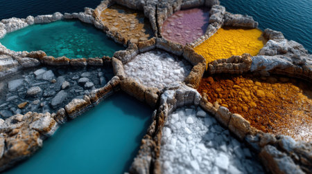 A series of pools of different colors and sizes. The pools are arranged in a circle and are filled with water. Concept of wonder and curiosity about the different colors and shapes of the pools