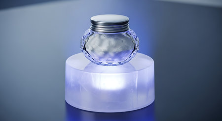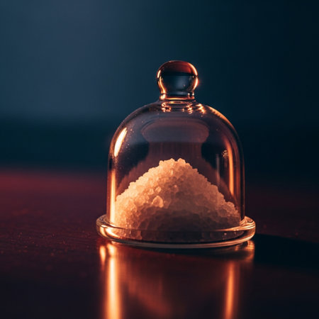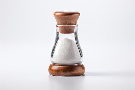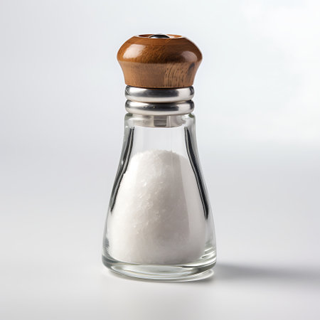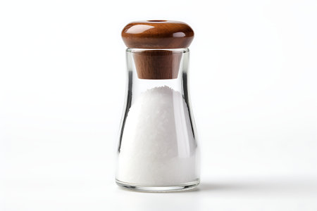 A transparent spice jar spilling white powder across a clean surface. This image presents a minimalist aesthetic, perfect for culinary themes and kitchen decor.