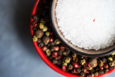 Rustic ceramic bowl with healthy sea salt and different types of pepper corn on concrete background with copy space