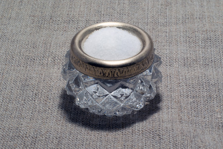 vintage faceted saltcellar made of crystal with a tarnished brass rim, full of salt, closeup, on a coarse linen tablecloth