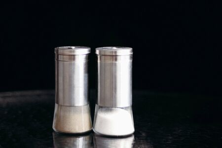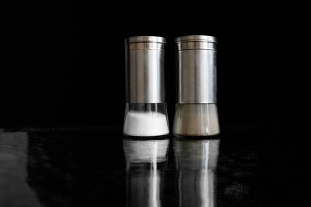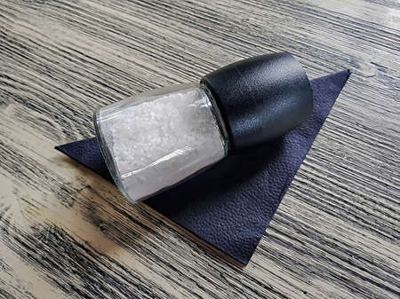 the salt of fine grinding scattered from saltcellar on a black table. place for text