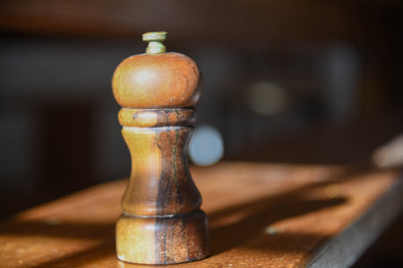 Close-Up view of pepper shaker On Table on light gray wall background. Space for text. Cooking concepts.