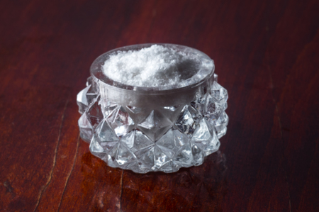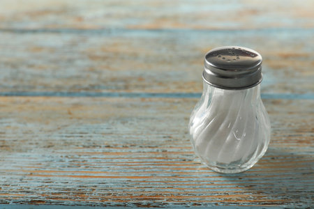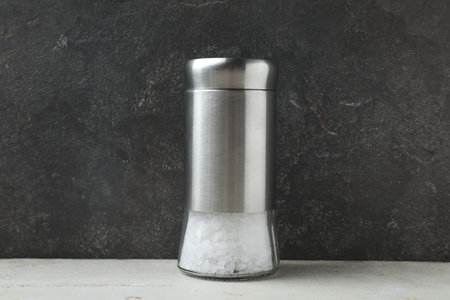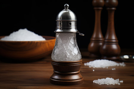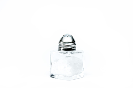 High angle close-up of salt shaker at table. unaltered, ingredient, food, rock salt and seasoning.