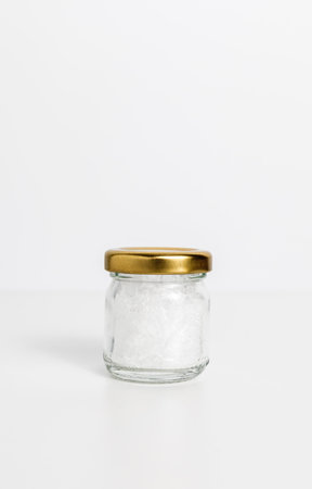 Menthol Crystals In Small Glass Jar On White Table. Copy Space. Golden Lid. Natural Remedy. Pure Natural Food Grade. Cooling And Freshening Effect. Pain Relief, Essential Oil Of Mint Plant. Vertical.