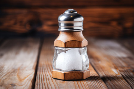 Selective focus close up shot of a salt shaker on a vintage wooden background