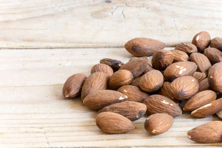 Almonds scattered on the wooden vintage table. Almond is a healthy vegetarian protein nutritious food. Almonds on rustic old wood