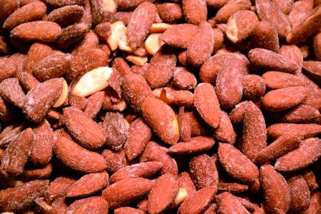 Spicy paprika roasted almonds. Aromatic roasted almonds. Crunchy almonds. Spicy nuts. Lots of roasted almonds with barbecue and paprika flavor.