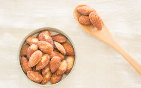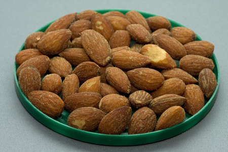 Dried brown toasted almonds nut inside white plate, Vegetarian meal, Healthy eating ready for eat
