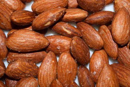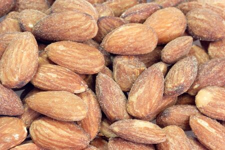 closeup heap of roasted salted almonds, peeled almonds