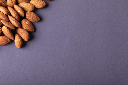 Nutritious almonds on gray background with copy space. unaltered, healthy food, snack, organic, nut and dried food.