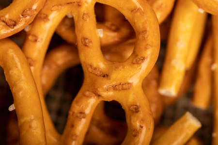 pile of salty mini pretzels on a yellow background. Popular beer snack. Background of baked salted pretzels. top view