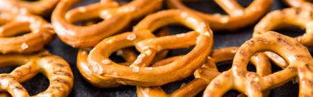 Pretzel for Oktoberfest on black slate background. Panorama photo.
