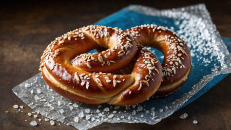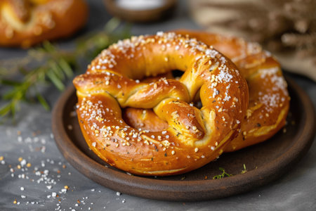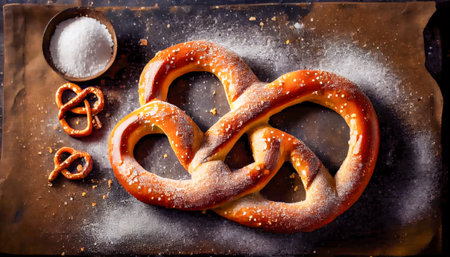 Freshly baked pretzels with a glossy finish and coarse salt on top. Perfect for snack and bakery content