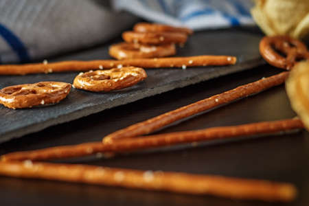 Typical German Bretzel. German food and snack. Delicious savory appetizer for lunch. Salted cracker bottom on slate bottom