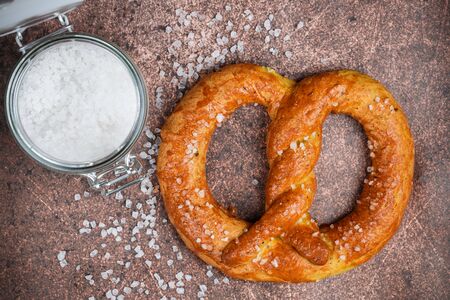 Freshly baked homemade Pretzel with coarse sea salt. German (Bavarian) beer appetizer. Selective focus