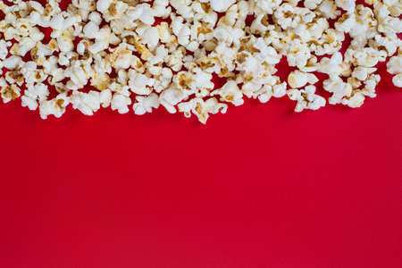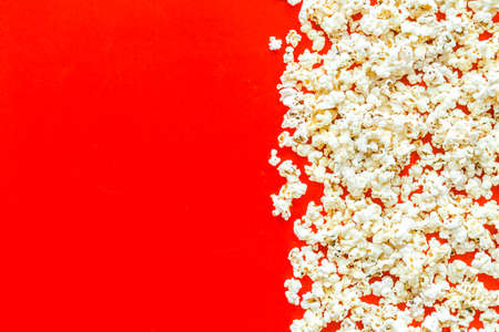Popcorn on a yellow background as a background image. Top view. Copy, empty space for text.