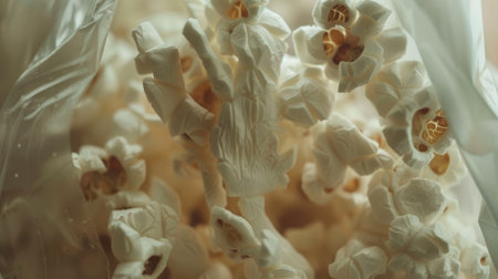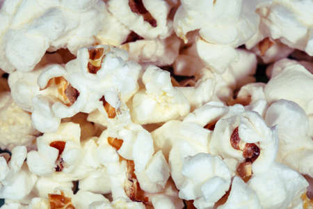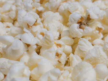 A close-up shot of a pile of popcorn kernels, showing their white and fluffy texture. The image captures the detail of the popcorn's surface and the kernels' golden color, highlighting the appeal of this popular snack.