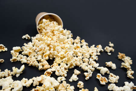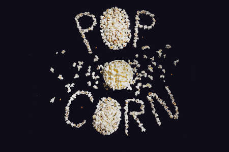 Tasty salted popcorn, on black dark stone table background, top view flat lay, with copy space for text