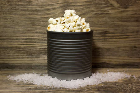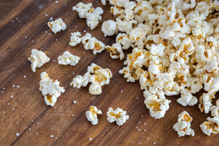 Delicious salty popcorn scattered across a dark wooden surface in warm light