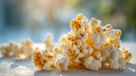 Crispy and Delightful Popcorn Pile Bathed in Gentle Sunlight for Snacking